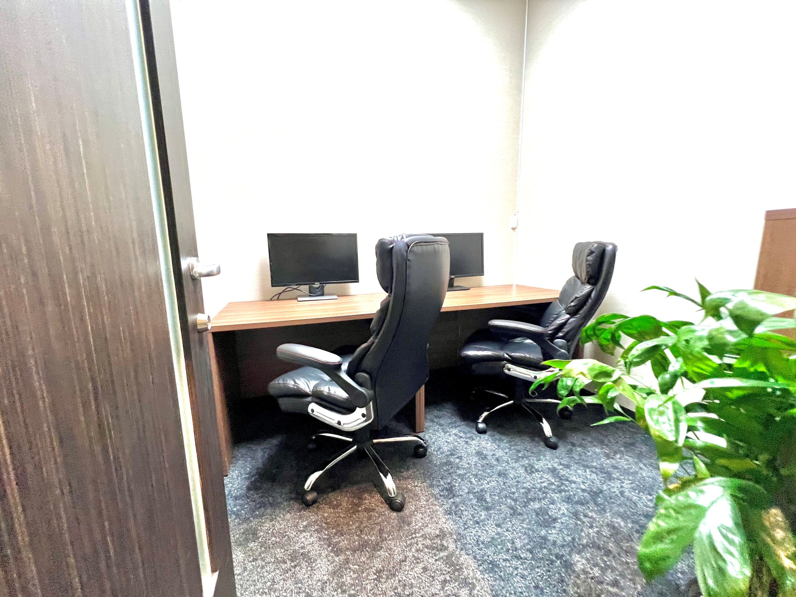 パーテーションや間仕切りなどではなく床から天井までの壁に囲まれた個室で、デスクを2台、プレジデントチェア、木製のキャビネットをご用意しています。